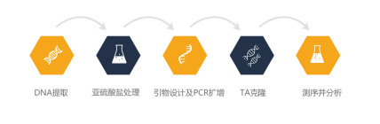 DNA甲基化存在于大多数真核生物中,一般发生在CpG双核苷酸中胞嘧啶的5’UTR区,起调控作用。CpG的胞嘧啶大概有80%被甲基化,20%处于基因调控区的CpG岛中。BSP甲基化测序(Bisulfite Genomic Sequencing PCR)的原理通过对基因组DNA进行重亚硫酸盐处理,非甲基化的胞嘧啶被脱氨基而转变成尿嘧啶,在随后的PCR反应中尿嘧啶转变成胸腺嘧啶,而甲基化的胞嘧啶不能被脱氨基,在反应完成时被保留,我们将扩增得到的PCR产物进行TA克隆测序,可以分析甲基化发生的具体情况。该方法实验结果准确性高,是甲基化检测的金标准。